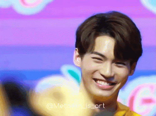 Winmetawin (น้องวิน) laughing and smiling brightly against a vibrant purple background.