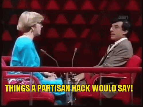 Game show contestant reacts excitedly as the caption 'Things A Partisan Hack Would Say!' appears on screen.
