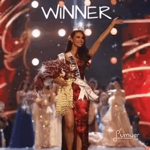 Catriona Gray, Miss Philippines winner, stands on stage in a red dress, holding flowers and a sash.
