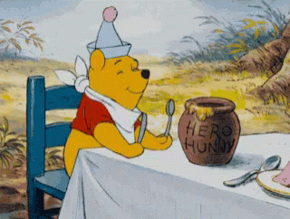 Winnie the Pooh, wearing a party hat and bib, happily prepares to eat honey from a 'HERO HUNNY' pot.