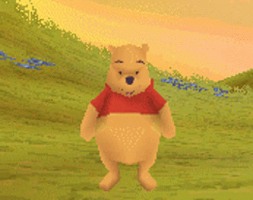 Winnie The Pooh in a low poly video game, standing in a green field with arms raised, from a PlayStation game.