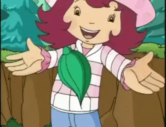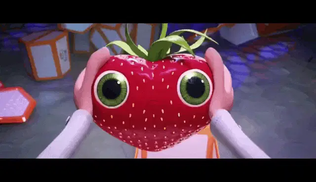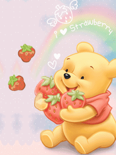 Winnie The Pooh happily holds a fresh strawberry with a colorful rainbow in the background.