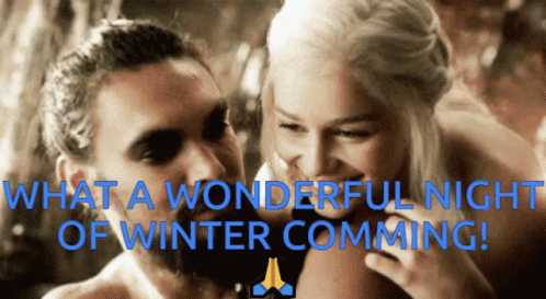 Khal Drogo and Khaleesi share an intimate moment with the text 'WHAT A WONDERFUL NIGHT OF WINTER COMMING!' overlay.