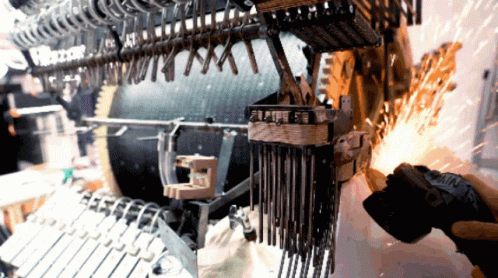 Martin from Wintergatan uses an angle grinder on the Marble Machine MMX, creating a shower of sparks.