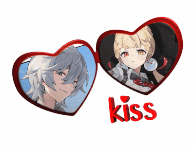 Anime characters Wise and Alice in a heart-shaped locket, closing to form a heart with kiss marks.