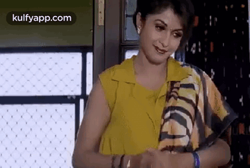 Nazriya Nazim smiles and performs a wishing gesture in a yellow top and patterned scarf.
