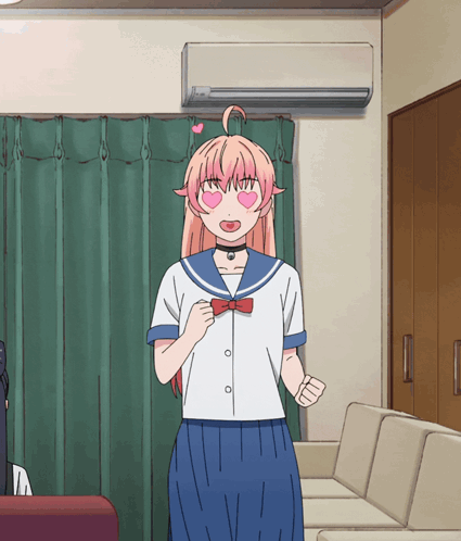 Nico Wakatsuki from Witch Watch shows her lovestruck heart eyes, expressing excitement in a living room.
