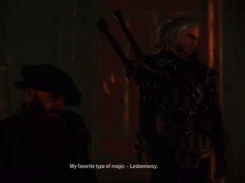 A dwarf character in The Witcher game states his favorite type of magic is Lesbomancy, with Geralt nearby.
