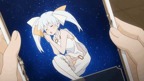 Tama from Wixoss, a white-haired anime girl, is shown sleeping peacefully on a starry background.
