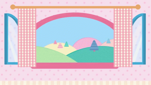 Molang the cartoon rabbit looks out a window with pink checkered curtains, seemingly searching or wondering.