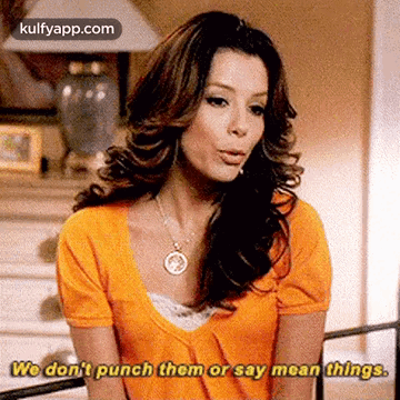 Eva Longoria in an orange shirt, delivering the line "We don't punch them or say mean things."