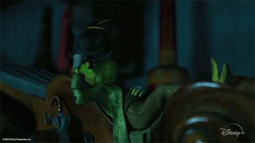 Jiminy Cricket, the beloved Disney character from Pinocchio, looks utterly surprised while sitting in a chair.