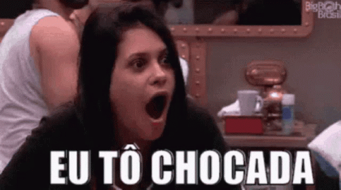 A woman reacts with a shocked expression, mouth agape, with the text 'EU TÔ CHOCADA' displayed.