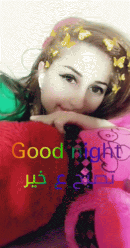 Mariana smiles for a good night selfie, lying on colorful pillows with butterflies in her hair.