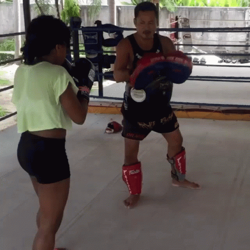 A woman practices Muay Thai kicks and punches with a male coach holding pads in a boxing ring.