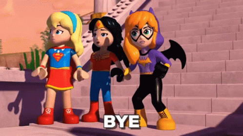 Wonder Woman, Supergirl, and Batgirl stand on stairs, then Batgirl disappears in a puff of smoke with 'BYE' text.