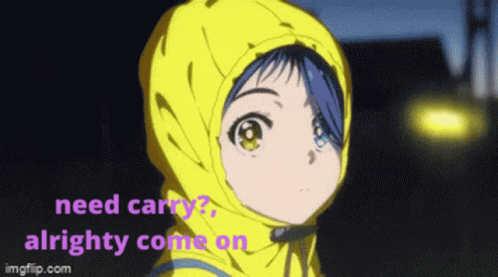 A character from Wonder Egg Priority, wearing a yellow hooded jacket, asks 'need carry?' and says 'alrighty come on'.