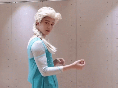 Wong Yukhei (Lucas) dressed as Elsa from Frozen, dancing and performing hand gestures.