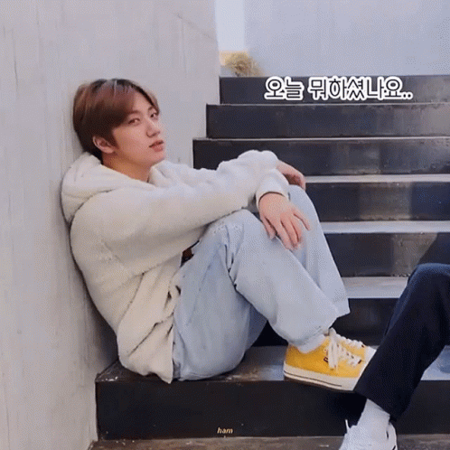 Cravity's Wonjin sits pensive on concrete stairs, rubbing his forehead, with a Korean caption.
