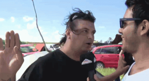 Man with unique hairstyle interviewed at an outdoor event, laughing and gesturing. Features "Woo Woo" and "Corderito" themes.
