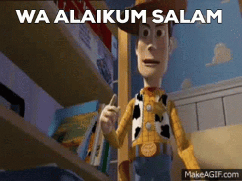 Woody from Toy Story gives a thumbs up while the text 'Wa Alaikum Salam' is displayed.