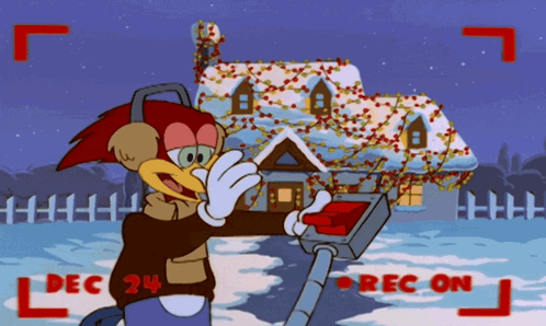 Woody Woodpecker (El Pajaro Loco) films a house decorated with bright Christmas lights in the snow.