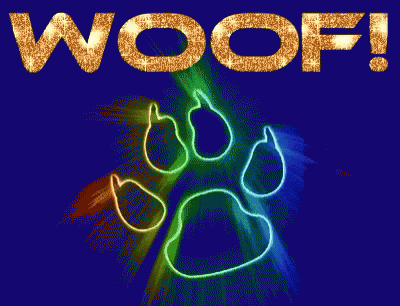 Animated 'WOOF!' text in gold glitter with a colorful, glowing paw print on a black background.
