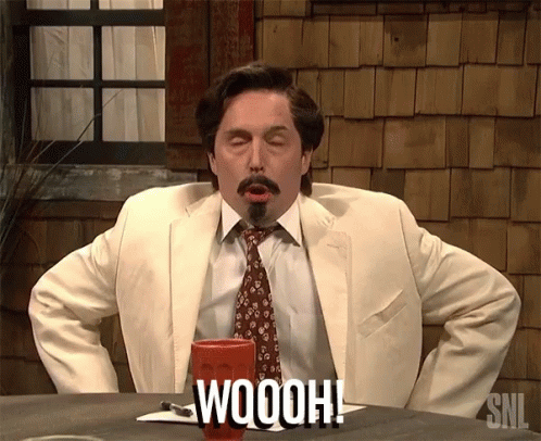 Man in a suit and tie exhales with relief, exclaiming 'WOOOH!' from an SNL sketch.