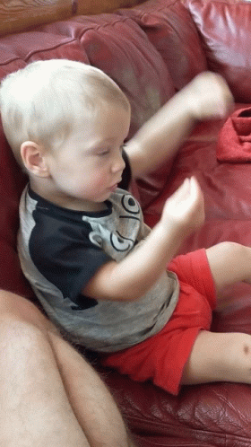 A happy toddler boy sits on a red couch, excitedly waving his arms in a 'woohoo' celebration.