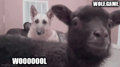 An adorable lamb and a German Shepherd dog interact, with 'WOLF.GAME' and 'WOOOOOOL' text overlays.
