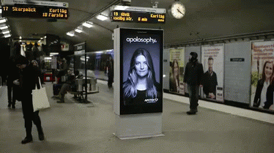 A subway train arrives, creating wind that dramatically blows the hair of a woman on an 'apolosophy' advertisement.