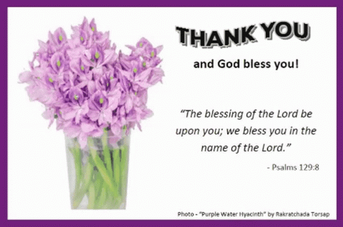 A thank you card featuring purple hyacinths and a blessing from Psalms 129:8.