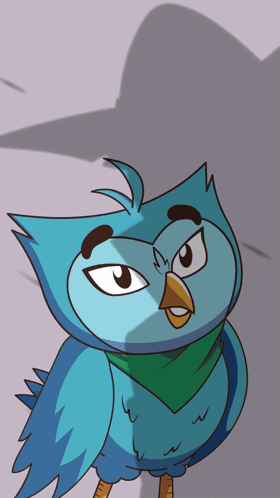 A vibrant blue cartoon owl with a green bandana, looking mischievous and ready to talk.