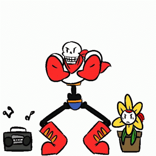 Papyrus and Flowey from Undertale are depicted working out with a boombox and a potted plant.