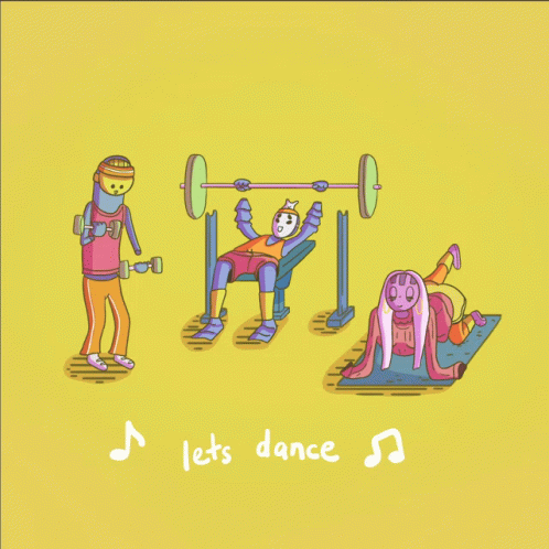 Three cartoon characters exercise to the phrase "lets dance," including weightlifting and yoga.