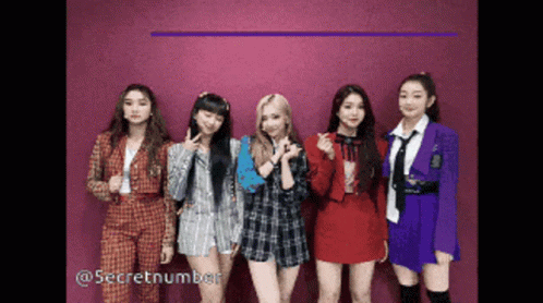 K-pop group Secret Number members Léa, Dita, Jinny, Soodam, and Denise pose for a photo against a purple background.