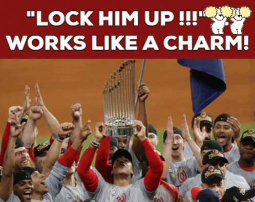 Washington Nationals celebrate their World Series win, with a political caption 'Lock Him Up!!! Works Like A Charm!'.