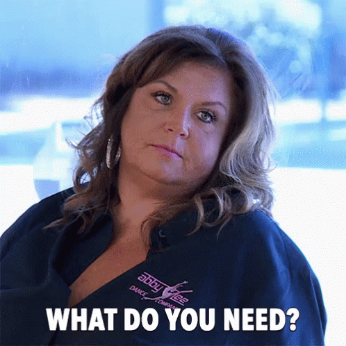 Abby Lee Miller asks 'What do you need?' with a straight face, wearing a blue jacket from Dance Moms.