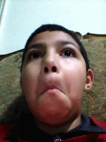 A young boy makes a funny, surprised face, looking upwards with pursed lips and wide eyes.
