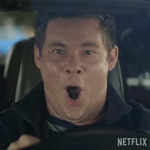Owen Browning (Adam Devine) makes a wide-eyed, shocked 'wow' face while driving a car.