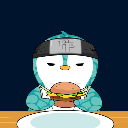 Pudgypenguins penguin gets mind blown after taking a bite of a delicious hamburger.