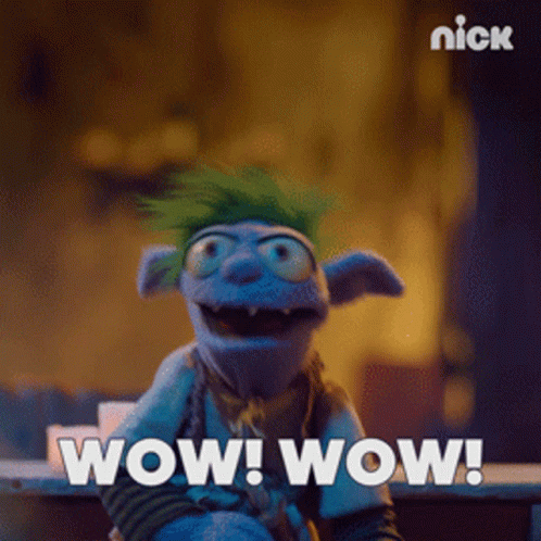 Evan, the puppet from The Barbarian And The Troll, excitedly says 'Wow! Wow!' with a wide smile.