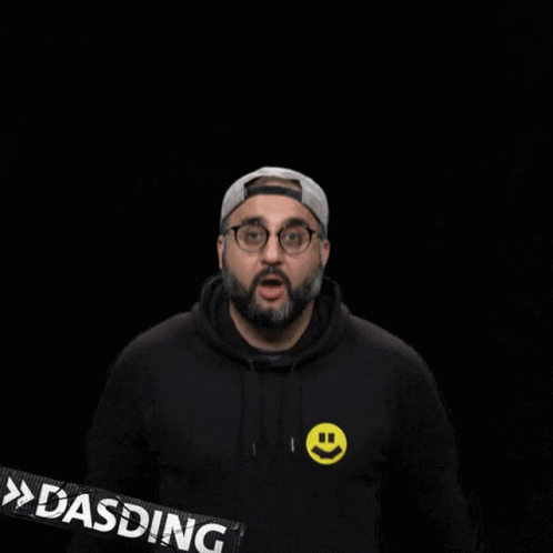 Phil Laude, wearing a black hoodie with a yellow smiley face, raises his hands in a "wow" gesture, with "DASDING" text.