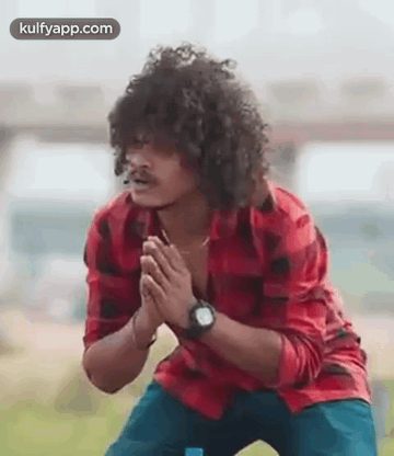 Pugazh, the actor and comedian, shows an energetic reaction, kneeling with hands clasped in a prayer-like gesture.