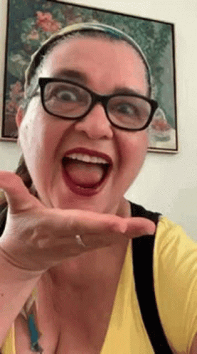 Maria, wearing glasses and a yellow shirt, makes a funny face and blows a kiss towards the camera.