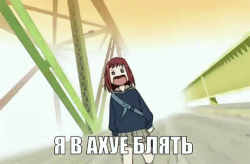 An anime character from FLCL reacts with a strong Russian expression of shock or amazement.