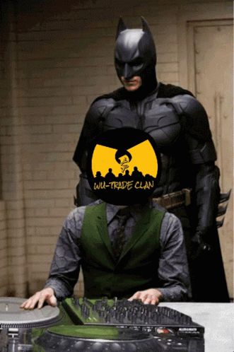 Batman watches as a person with a Wu-Trade Clan logo head mixes tracks on a DJ setup, wearing a green vest.