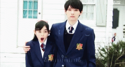 A surprised girl and a boy in school uniforms stand together, with the girl reacting dramatically.
