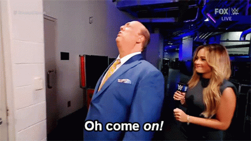 Paul Heyman reacts with an exasperated 'Oh come on!' while being interviewed by Kayla Braxton on WWE.