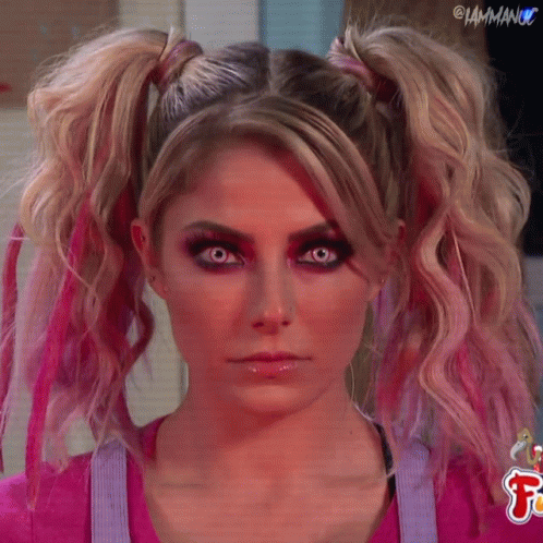 Alexa Bliss displays an evil smile with white eyes and pink pigtails in her Firefly Fun House persona.